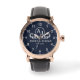 Create your own custom brand luxury watch. Timeless elegant watch dial design with fine indexes. Add your own custom monogram, custom name, designer name, initials, year of birth, logo, icon, photo image, etc. Sophisticated presence of modern minimalist style with elegant script typography template. Luxurious watch for him. Make it a cool new gift for boyfriend, boyfriend, dad, father, husband, brother, son, boyfriend, grandpa, grandpa, grandfather, stepdad, uncle, coworker, employee, company boss, business partner, colleague, best friend, teacher, coach or retiree. Unique monogrammed gift ideas for men's birthday, graduation, anniversary, retirement, vacation, wedding party, appreciation, employment, work, etc. Large diameter about 44mm. Classic vintage style with 22mm fashion black leather wrist strap. White or custom background color. Perfect for 20th, 30th, 40th, 50th, 60th, 70th, 80th, 90s celebrations. Affordable quartz watches under $100. Nice for casual daily wear and special occasions. Also available for other models with brown leather or steel bracelet.