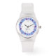 This 80s style watch with durable clear silicone buckle strap features a circular wreath of purple pansies, accented with soft blue foliage, calligraphy monogram initials and small primary numbers in a subtle grey. These were called "Jelly watches" in the 80s. Easily change or remove the initials using the Template provided. White and black silicone straps are offered along with 15 other styles. See "About" for more information.