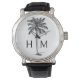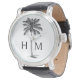 Este relógio de inspiração costeira moderno apresenta uma palmeira negra com um monograma que você pode personalizar com sua escolha de iniciais.