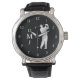 Aqui está um relógio atraente que é perfeito para o fã de golfe! Ele apresenta um golfista prateado brilhante em cheio balançando no centro, com seu monograma triplo em prata correspondente correndo verticalmente do lado esquerdo. Os números também estão em prata, e tudo é colocado sobre um fundo negro dramático.