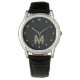 Monograma personalizado, relógio preto e branco com números brancos simples. Este elegante relógio minimalista combina o estilo clássico com um toque pessoal, apresentando uma inicial dourada (nota: o ouro é de cor plana sem nenhum cintilador) numa face preta, realçada por simples números brancos para fácil leitura. O design também inclui um nome de script branco-na moda, adicionando um elemento personalizado que torna este relógio verdadeiramente exclusivo. Perfeito para o veste do dia a dia ou para ocasiões especiais, é um presente ideal para aniversários, feriados, ou só porque. Com sua caligrafia limpa e aparência de eterno, esse relógio personalizado é um acessório chique, mas prático, para qualquer armário.