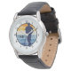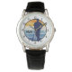 Este relógio único apresenta um jogador de beisebol marinho azul-silhueta que se debruça sobre seu bastão. A imagem é colocada em um círculo de estilo retrorreflector dourado e fundo de faixa azul. Seu monograma de letras triplas está do lado direito. Números pretos ao redor do perímetro facilitam a leitura do relógio.