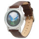 Um relógio com uma bela fotografia de uma cena agradável e tranquila da natureza. Floresta verde vibrante na frente e montanhas azuis sombrias nas costas. Com um céu branco nublado e sonhador. Mistura e mágica.