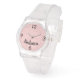 Um relógio esportivo com fivela de fecho de silicone clara e durável e face brilhante rosa pálido. O nome é uma fonte de script em negrito. Troque facilmente o nome, substitua-o por iniciais monográficas ou remova-o, utilizando o Modelo fornecido. Escolha entre outros estilos e cores.
