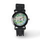 O suave gigante da selva em um tableau que inclui um crocodilo, um macaco, uma borboleta e uma cachoeira. Pulseiras de relógio reluzentes em vermelho, rosa ou prata.