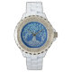 Rinestone é um relógio de esmalte branco com uma imagem de um aqua e cinza "Árvore da Vida" em azul real. O símbolo da árvore da vida representa nosso desenvolvimento pessoal, singularidade e beleza individual. Assim como os ramos de uma árvore se fortalecem e crescem para o céu, nós também crescemos mais fortes, lutando por mais conhecimento, sabedoria e novas experiências à medida que nos movemos pela vida. Veja toda a coleção Este e Aquele Relógio na seção ACESSÓRIOS.