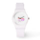 Os relógios são a melhor maneira de se expressar. O relógio feminino exibia a citação "Carros são as esculturas de nossas vidas cotidianas." por Chris Bangle em tons de branco, vermelho e roxo em um conceito moderno de design.