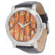 Este design de relógio tem duas camadas de ovais num campo de amarelo, marrom e laranja.