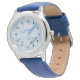 O relógio desta criança é impresso com gráficos estrelados azuis bonito em um fundo com padrão abstrato azul claro, com simples algarismos negros, certamente agradando a qualquer menina. Sua escolha de vários estilos de bezel e de watchband