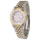Este relógio feminino tem um design de século médio de ovais concêntricos e metades ovais desbotadas espalhadas sobre a design.