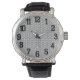 Este relógio masculino tem um design de Arte Deco de linhas pretas curvas em forma de triângulo num campo de branco repetido através do design.