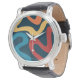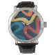 design de arte contemporânea abstrato com decoração de ondas coloridas (azul, vermelha, amarela, laranja) sobre fundo azul marinho