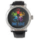 Esta design apresenta as mãos arco-íris junto com o texto "Um Amor". As mãos simbolizam o amor universal e o respeito por todas as pessoas, independentemente da cor da sua pele. Mais opções de cores estão disponíveis.