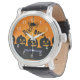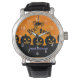 Oooh! Feliz relógio de pulso do Halloween com abóboras em laranja e preto com algarismos brancos na cara do relógio.