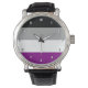 A bandeira do orgulho assexuado consiste em quatro faixas horizontais: preto, cinza, branco e roxo de cima para baixo. O sinalizador foi criado pelo usuário da AVEN standup em agosto de 2010, como parte de um esforço comunitário para criar e escolher um sinalizador. A faixa negra representa a assexualidade; a faixa de cinzas representa cinzas-ases e demissexuais; a faixa branca representa aliados; e a faixa roxa representa a comunidade.