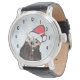 Um relógio com uma fotografia natural de uma lontra fofa segurando seu rosto em suas patas. Vestindo um chapéu de natal vermelho desenhado à mão. Um padrão de fundo em flocos de neve.