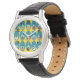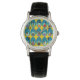 Este relógio tem uma design moderna do século médio de ovais azuis com ovais e círculos dentro em cores retrorativas de azul, roxo, verde, laranja, vermelha, rosa, marrom e branca num campo de ouro.