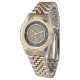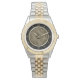 Este elegante relógio apresenta um padrão central grego que dá uma sensação de abstrato ao design. Um círculo dourado separa o padrão dos números e diamantes que ajudam a facilitar a leitura do relógio. Tudo é colocado num fundo negro dramático.