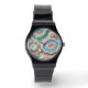 Melhore a sua roupa com este relógio de pulso elegante, que apresenta um impressionante padrão de arte de onda de mármore aqua verde, branco, rosa-pincel e dourado. Este relógio faz um presente ideal para si mesmo ou para alguém especial, e serve como uma bela adição à sua moda do dia a dia.