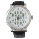 Um relógio com sabor ocidental rústico. Projetado com um monte de cactos verdes bonitos em um padrão repetitivo. Especificamente, cacto cor verde picante, em todos os tipos de formas e tamanhos, cada um sentado no seu pote de flor azul escura. Pequenos triângulos decorativos entre eles. Ilustração engraçada.