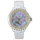 Um pássaro azul-eurasiático, Cyanistes caeruleus, agarrado e pendurado a partir de um galho de uma árvore florescente de cerejeira, cor-de-rosa, na primavera. Uma bela foto de pássaro tirada por Katho Menden, este relógio é uma ideia de presente para amantes da natureza.