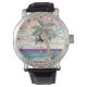 This delightful round wall clock features a charming stained glass style illustration of a single palm tree on a serene beach. Soft pastel hues of pink, peach, blue, and lavender create a calming sky and ocean. The stylized design evokes a gentle, retro-inspired tropical vibe. With clear numerals and black hands, this clock combines artistic appeal with practical timekeeping, perfect for a relaxed setting.