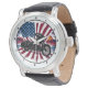 This watch face features a black bagger-style motorcycle, centered against a dynamic American flag backdrop that radiates outwards. A stylized sun is setting on the horizon behind distant mountains. The design combines patriotism with a love for motorcycling, clearly displaying white watch hands and numbers for time-telling.