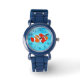 O peixe palhaço vê cara com banda preta e anel de números em incrementos de 5 para ajudar uma criança a aprender a contar o tempo. As mãos dizem, "hora" e "minuto" neste estilo, que é fácil de mudar, e escolhem uma cor a partir de uma seleção ampla. O fundo azul do oceano tem números negros ao redor da borda.