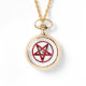 Pentagrama vermelho, invertido, texturizado em círculo, sobre fundo branco. Símbolo oculto. 666