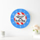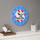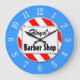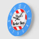 Um relógio de parede único lendo Barber Compra em letras de bloco com espaço para o seu nome em um script retroativo em um fundo listrado vermelho e branco cercado por letras brancas em um rosto azul. Clique em Personalizar para alterar fontes, dimensionamento, cores de fundo e muito mais, até salvar seu design para mais tarde.