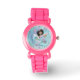 Cabelo preto, sereia, pulso, vigia uma garotinha com cores azuis, cor-de-rosa e douradas. Personalizado com o nome da criança ou qualquer texto personalizado. Ele apresenta um golfinho, tartaruga, estrela, castelo e criaturas marinhas bonitos com escalas falsas de brilho no fundo.