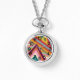 Este relógio feminino tem uma design retrô de 1970 é feito de camadas de cabeça para baixo Vs em três lugares todos em cores retrorreflectoras.