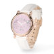 Mother's day gift rose gold watch featuring white flowers and butterflies on a blush pink background with the word "mum".