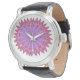 A watch with a pink and pale blue flower design on the face features a Aztec-inspired aesthetic, with a white background to highlight the bold, abstract flower design.