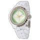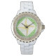 Este padrão foi inspirado por um padrão de blocos de colcha chamado "Movimento Perpétuo". Um pino de 4 pontos marca as 3, 6, 9 e 12 horas e está rodeado por bolinhas verdes e brancas.