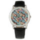 Este relógio masculino tem um design geométrico de quadrados dentro em tons mais leves de azul, cor de rosa, laranja, bronzeado, esbranquiçado, manga e cinzas em um campo de preto.