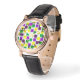 Este relógio feminino tem uma design geométrica de quadrados em roxo, amarelo e verde espalhados com seus contornos.