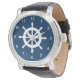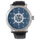 Presente náutico personalizado para homens, mulheres e crianças. Relógios marítimos com o logotipo da roda do navio e cor de fundo personalizável. Como opção, adicione suas iniciais de nome próprio. Legal ideia de presente de aniversário para capitão de barco, marinheiro, primeiro-oficial, esposa de marinheiro, filhos (menino ou menina), amigo, pai, pai, avô, noivo, noivo etc. Ícone do capacme do Boat Branco com cor azul de fundo do marinho. Banda de couro preto. Acessórios de tendências para ele e para ela.
