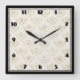 Um relógio com um padrão elegante, com biqueirão dourado em um padrão repetitivo em um fundo creme colorido.