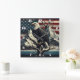 Uma águia poderosa fica em frente a um cenário de montanha, com um lago e um barco à vela visíveis, refletindo a beleza da natureza.