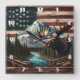 Um grande alce fica perto de um rio, enquadrado por pinheiros e montanhas, com um pano de fundo da bandeira americana feito de madeira.