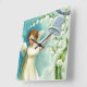 pintura cristã vintage em azul e branco com um anjo giro flutuando em uma nuvem e tocando um sino de natal.