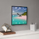 A clock with a beautiful photograph. A scenic tropical beach with aquamarine water and a white sandy beach with a lush forest in the back. A solitary umbrella available for those who love seclusion.