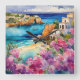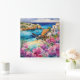 "Arcos Pelo Mar". Uma vista idílica de uma bela baía, com um barco solteiro. Uma pequena praia arenosa é enquadrada por um belo mar de azure e flores rosa e roxas.