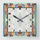 Relógio de parede acrílica de 10,75" x 10,75" com imagem de um trabalho de arte de vidro manchado com floco Art Deco, que lembra determinadas 1920. Fronteira verde. Rosto de relógio fácil de ler em quadrado branco transparente com borda fina e preta. Veja toda a coleção Este e Aquele Relógio na seção HOME.