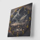 Uma peça de madeira bem trabalhada mostra um celeiro debaixo de um céu estrelado, apresentando um cavalo, lua e elementos celestes. O nome Linda é exibido com destaque.