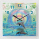 2 golfinhos que nadam no oceano perto de uma ascensão bonita das cores e da água com 2 planetas, uma lua e um sol colorido. Cores cor-de-rosa, azuis, do aqua, as amarelas e as verdes na água e no céu.