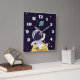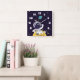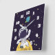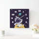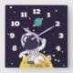 A clock with a dark blue background with yellow stars scattered around. Layered over top is an illustration of a spaceman wearing a white astronaut suit floating above the moon. Waving hello as he explores space. Off in the distance is a planet with rings and a rocket ship flying off into space.