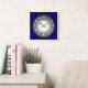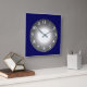 Um design dramático de relógio em azul escuro com um centro redondo iluminado de cinza prateada. Números brancos e mãos de relógio prateado completam este design. Fácil mudar de quadrado para redondo ou adicionar um quadro.