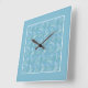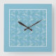 Um relógio de na moda quadrado com um tema náutico de embarcações à vela e gaivota em branco sobre um fundo azul-marinho claro.